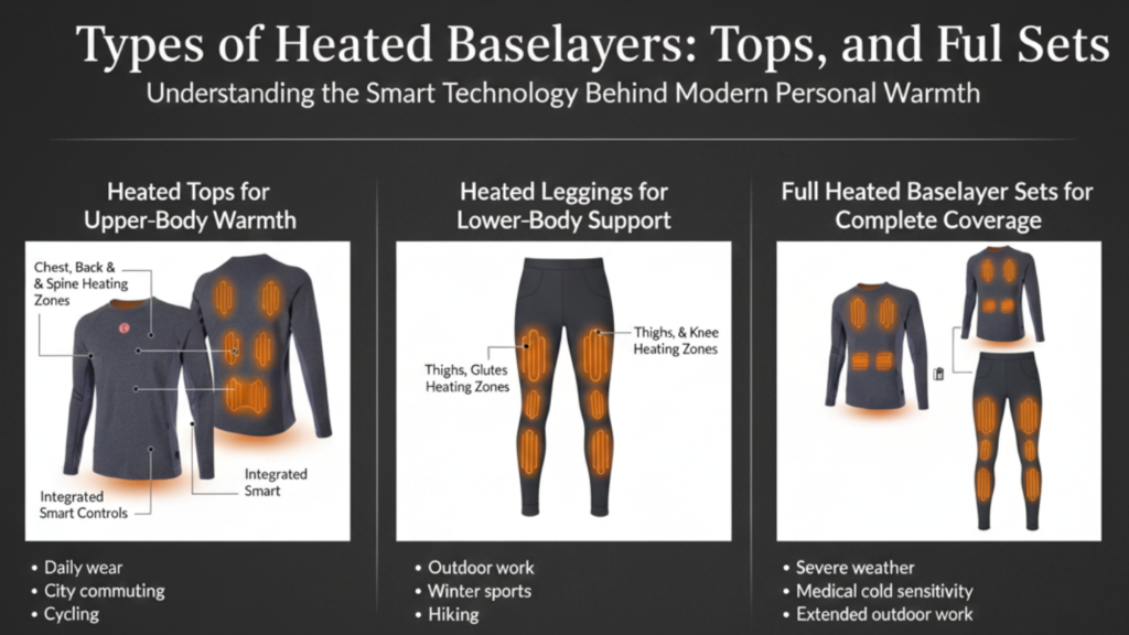 Heated tops (upper body): Long-sleeve baselayers that warm your core with heat zones on the chest, spine, and upper back. Ideal for commuting, cycling, and daily wear under a jacket. Common fabrics: stretch synthetics or merino blends.